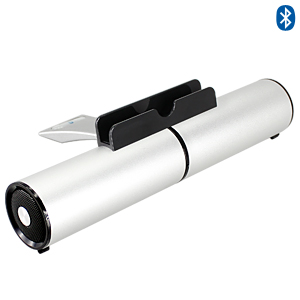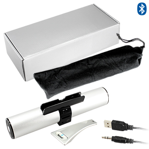 Altavoz portátil cilíndrico inalámbrico Bluetooth 2.1 + EDR. Con cargador USB/microUSB y manual de uso en inglés. Batería incorporada. Rango: 10 metros aprox. Bolsa aterciopelada negra. Presentación en caja de regalo plateada.