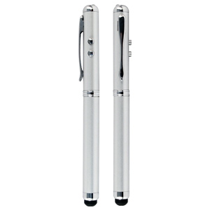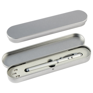 Bolígrafo metálico multi-función 4 en 1. Incluye bolígrafo, linterna LED, puntero láser y NUEVO puntero «Touch-Screen» para pantallas táctiles. Presentación en estuche de aluminio. Escritura Azul.