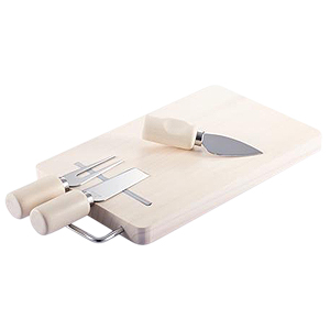 Cheese Set con 3 prácticas herramientas para quesos + tablero de madera de Hevea (Rubberwood). Incluye banda magnética sobre la tabla, para fijar las herramientas a ella.