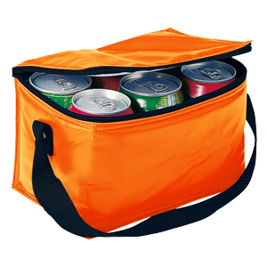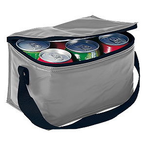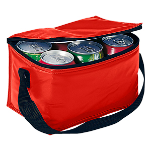 Cooler para 6 latas de bebidas o cervezas, también utilizable como lonchera. Tela exterior 420D/PVC Poliéster. Tela interior PVC metalizado aislante.