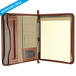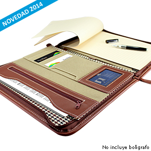 Deluxe Carpeta ejecutiva «Windsor» en Eco-Cuero café y polyester café claro. Con bolsillo delantero. En interior contiene Block 20 hojas lineadas color beige, Bolsillo para documentos, Bolsillo con Cierre, Porta-Bolígrafo y Compartimentos para Tarjetas. Forrada en fina tela escocesa.