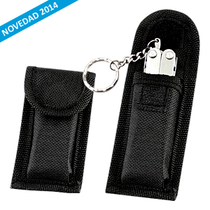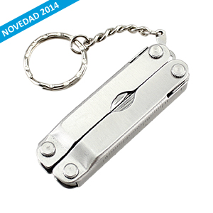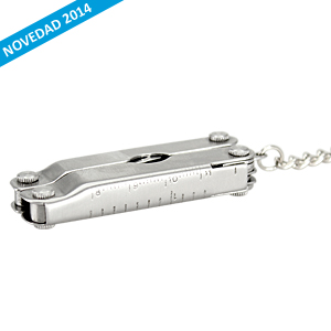Multiherramienta metálica plegable de 10 funciones, con llavero. Incluye mini-regla en cm. y pulgadas. Presentación en estuche de polyester negro y caja plateada de regalo.
