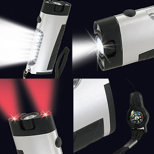 Linterna LED 4-en-1. Incluye Linterna 1 LED + Lámpara 8 LED + Estroboscópica roja de emergencia + Mini-Brújula en huincha negra removible para transportar.