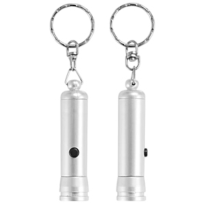 Llavero-Linterna LED plástica color plata. Usa 3 pilas botón (incluidas).