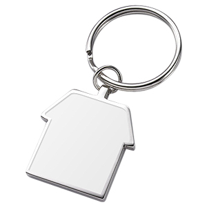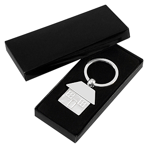Llavero Metálico Casa, con reverso liso. Presentación en estuche laminado negro con cuna aterciopelada