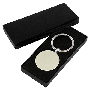 Llavero Metálico Redondo Plano. Presentación en estuche laminado negro con cuna aterciopelada.