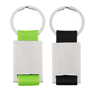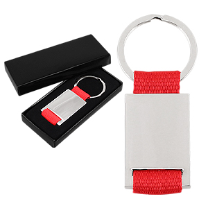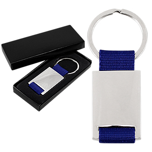 Llavero Metálico «Strap» con huincha de polyester de color. Presentación en estuche laminado negro con cuna aterciopelada.