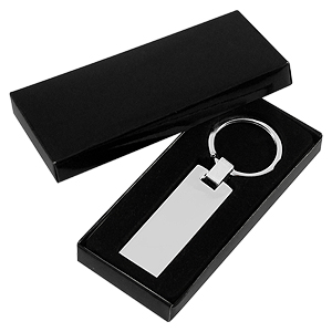 Llavero Metálico Rectangular Plano. Presentación en estuche laminado negro con cuna aterciopelada.