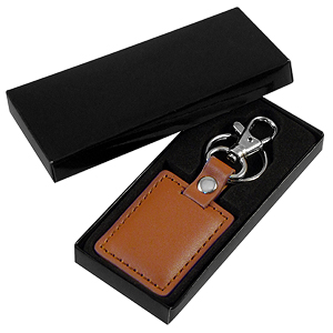 Llavero de simil Cuero Café + Mosquetón Metálico. Presentación en estuche laminado negro con cuna aterciopelada.