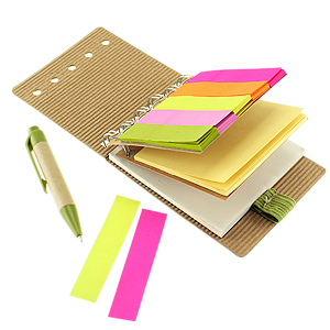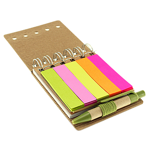 Memo Set Ecológico. Incluye Bolígrafo Ecológico corto + 125 banderitas adhesivas de colores + 25 post-it cuadrados + Block de Notas 40 hojas blancas. Tapas gruesas cartón ecológico 600gsm, exterior liso/interior plisado, en Espiral Doble Cero Metálico.