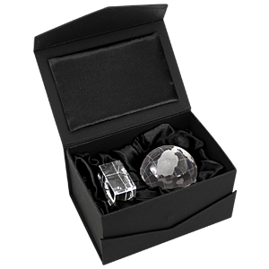 • Tamaños: Base: 4 x 2.4 x 4 cm. / Esfera: D6 cm. / Caja: 14.4 x 10 x 7.5 cm. • Material: Cristal. • Presentación: Caja Cartón Forrado con Cuna satinada negra.