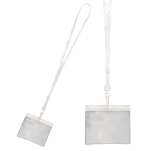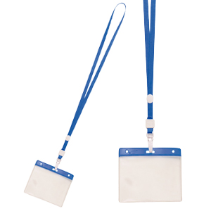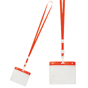 Porta-Credencial de PVC translúcido y banda superior de color, con lanyard para colgar. Para credenciales tamaño Tarjeta de Crédito. Presentación Formato Horizontal.