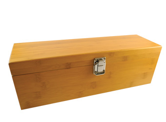 36 x 11,5 x 11 cm. Caja de madera Bamboo, cierre metálico con set de bar en Bamboo y Metal: Cortagota, Vertedor, Tapón y Sacacorchos. Tabique regulable para botellas chicas.