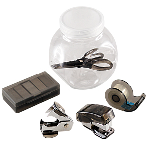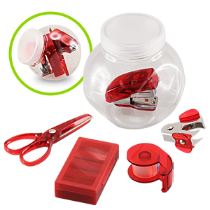 Set de oficina en frasco plástico transparente con tapa frozen. Ideal espacio para logo en tapa.