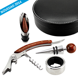 Set de 4 accesorios metálicos para el vino, con terminales de madera barnizada, presentación en estuche redondo de PU negro con tapa.