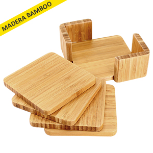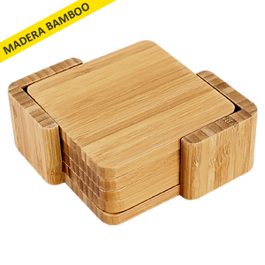 Set de 4 posavasos cuadrados 100% madera Bamboo, en contenedor 100% madera Bamboo.