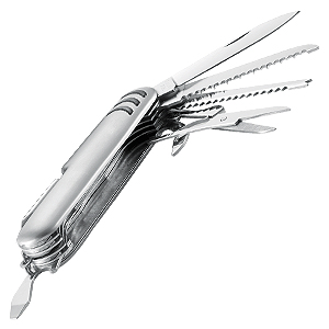 Set de Supervivencia «XD», incluye Cortapluma 12 funciones + Llavero-Linterna LED metálica de 9 cm + 3 pilas botón tipo AG3, presentación en elegante Estuche Negro con Gris.