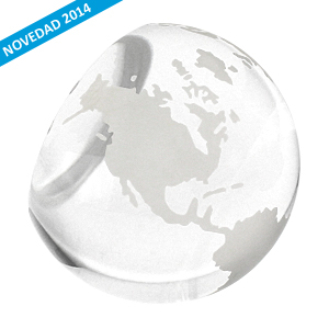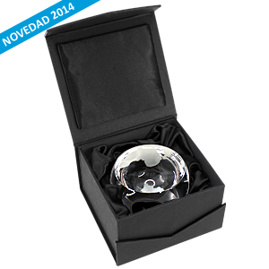 Trofeo de Cristal modelo «Planet» en forma de planeta con lado truncado. Presentación en caja de cartón forrado negro.