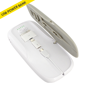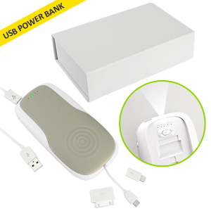 Deluxe Cargador USB Power Bank. Incluye cable USB-microUSB + multiadaptador retráctil para iPad, iPod, iPhone 5, Samsung Galaxy, etc. Batería recargable. Presentación en caja de cartón blanco.
